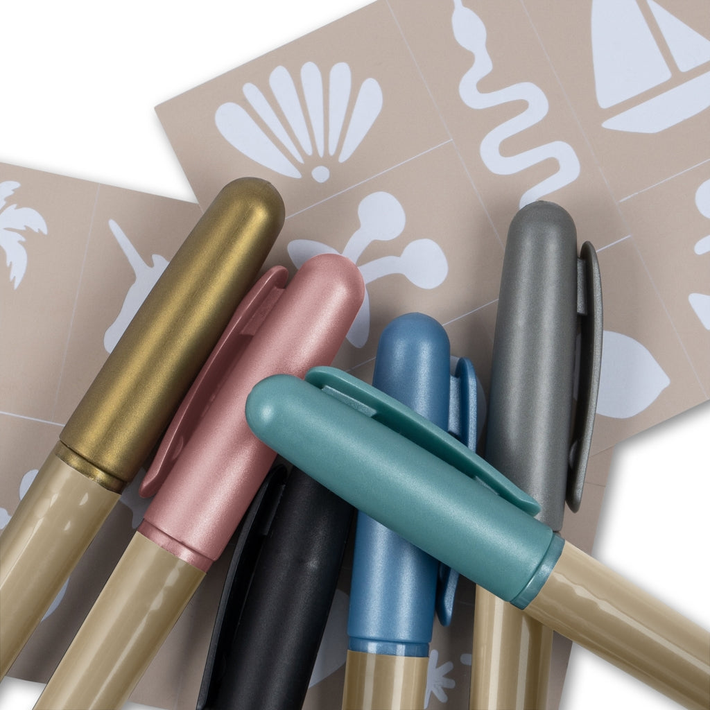 Tattoo pen set bestaande uit: 6 verschillende gekleurde tattoo pennen en 20 herbruikbare sticker stencils om te gebruiken op de huid.